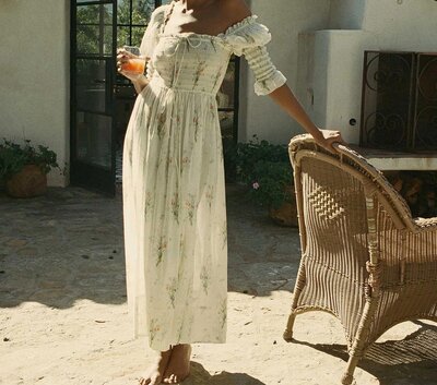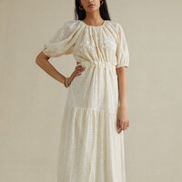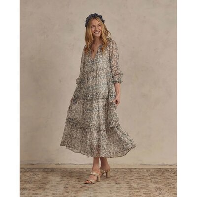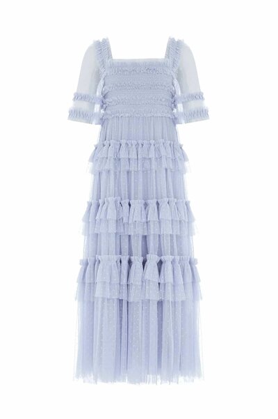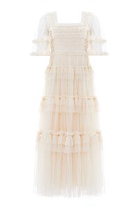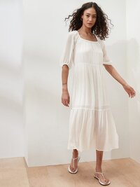 Square neckline with a softly smocked bodice and tiered skirt that reads feminine without bulk. The vertical tiers photograph as gentle rhythm and add flattering movement.