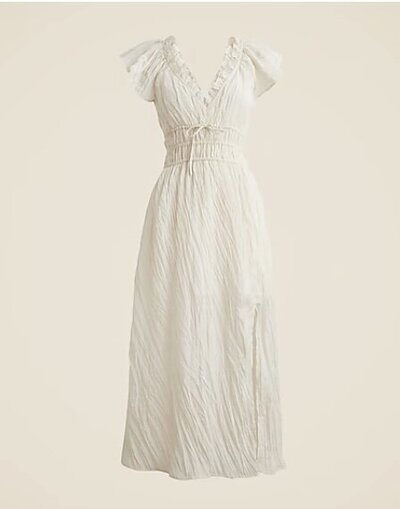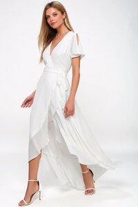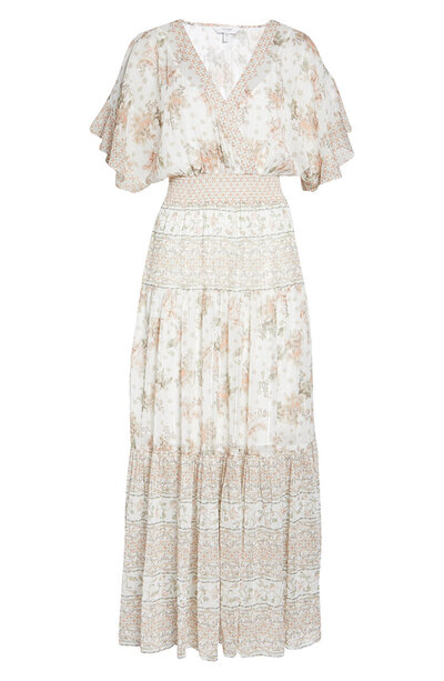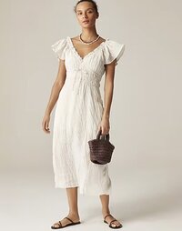 True wrap with a waist tie and flutter sleeve that defines the waist and sculpts the shoulder line. The skirt opens slightly in motion for an elegant, elongated leg line.