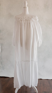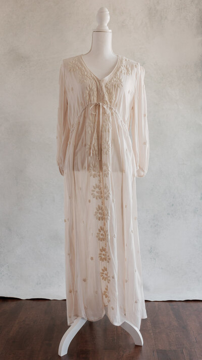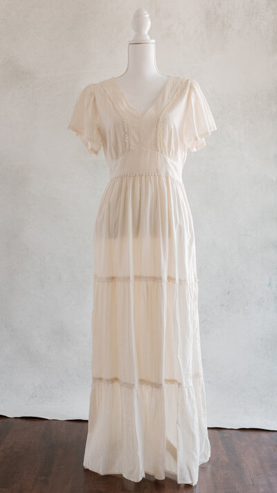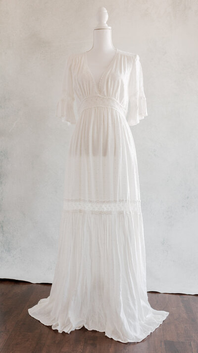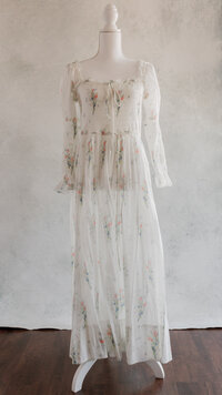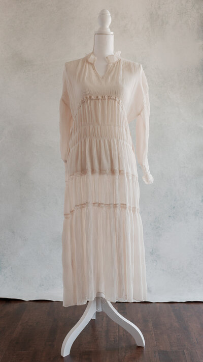 A delicate gown with ankle-length layers that ripple with each step, offering a sense of movement and grace. Its airy fabric brings lightness and romance into portraits.