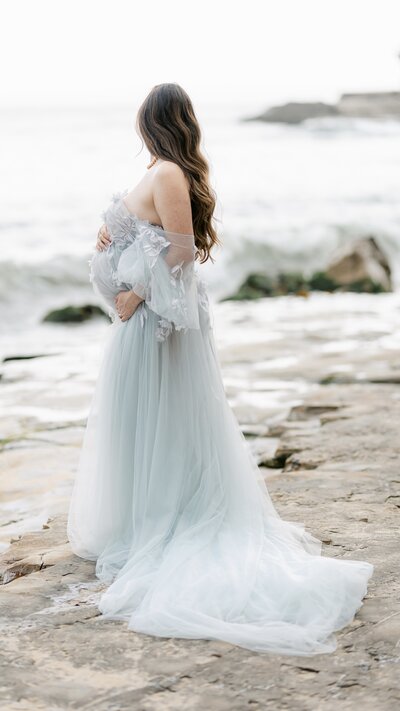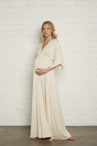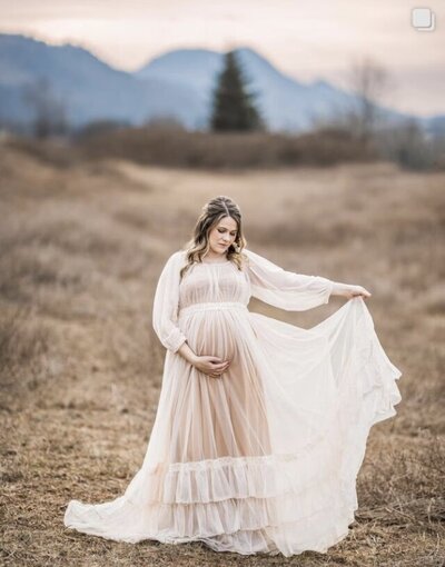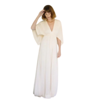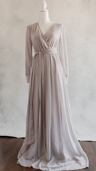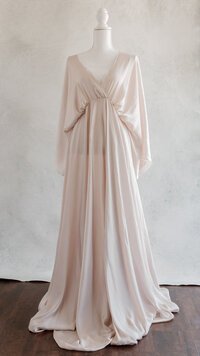 A flowing gown with sheer sleeves and soft drape that flatters beautifully in every pose. Its romantic movement and airy fabric create a luminous, ethereal feel in portraits.