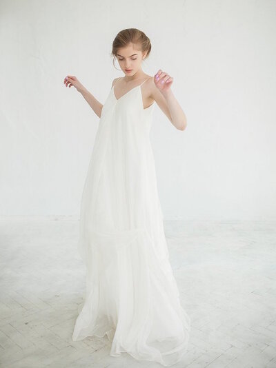 An elegant dress with a structured bodice and flowing skirt, offering both ease and refinement. Its clean lines photograph beautifully in both intimate and expansive settings.