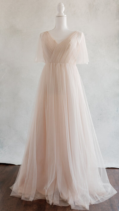 Fine tulle overlay over an A-line base; diffuses light and adds a whisper of volume. Reads romantic without feeling “bridal.”