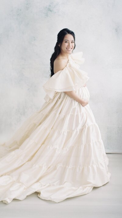 A gown with elegant drape and soft volume, striking a balance between ease and refinement. Its flowing fabric moves gracefully, adding dimension to portraits.