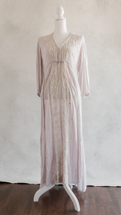 Pairs beautifully with light neutrals and natural fabrics. Children’s textured knits or muted prints add subtle charm. Works best when family styling feels relaxed and cohesive, echoing the gown’s softness.